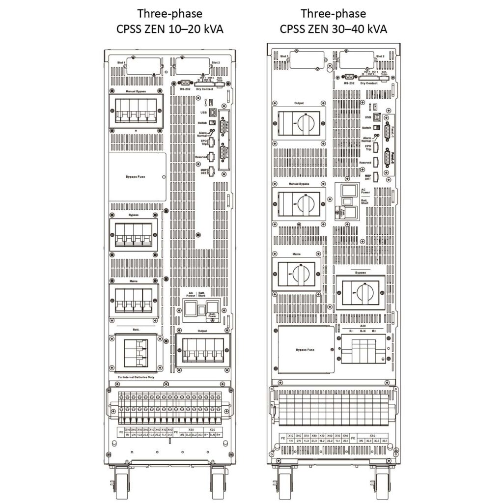 - The three-phase CPSS ZEN 10-40 kVA 4-10 kVA includes a wide range of communication options: two ports (RS232, USB), plus two additional slots for optional cards (SNMP, RS485 ModBus, dry contact relay).